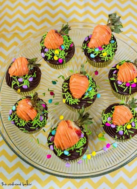 The Easter Bunny will surely stop at your house if you make these adorable Carrot Patch Chocolate Cupcakes, topped with strawberries coated in orange-colored vanilla candy coating.