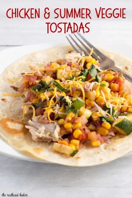 Chicken and summer veggie tostadas are loaded with lots of fresh farmers market vegetables and herbs. It's a healthy meal that's easy enough for any weeknight!