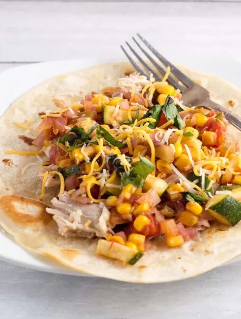 Chicken and summer veggie tostadas are loaded with lots of fresh farmers market vegetables and herbs. It's a healthy meal that's easy enough for any weeknight!