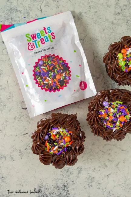 Turn cupcakes into Cauldron Cakes for Halloween! Chocolate cupcakes are the base for a marshmallow potion, and Sweets & Treats sprinkles bubble out the top.