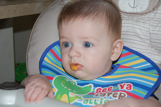 It's been a month since I posted about my trepidation of introducing Liam to solid food. We started a bit earlier than I had planned. At about 5.5 months, Liam had reverted to nursing every two hours (he had been eating every three hours), took great interest in watching us eat and had started imitating our chewing motions. He even tried to grab my garlic bread out of my hand!
