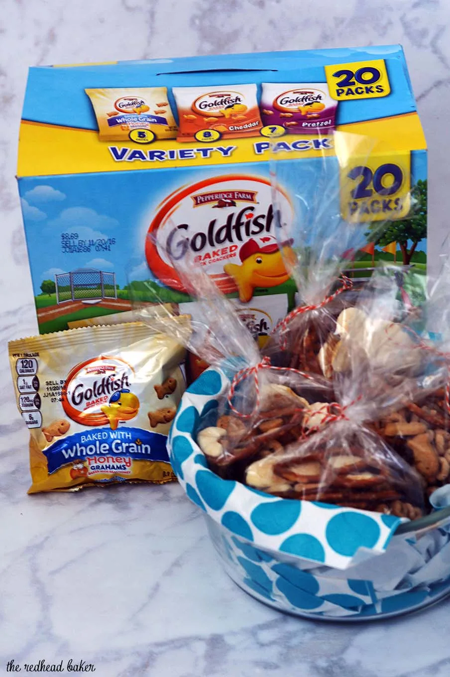 One grab-and-go snack I keep on hand is a favorite of both mine and my son’s. It’s a combination of Goldfish® Baked with Whole Grain Honey Grahams crackers, pretzels, freeze-dried apples, apple-flavored toasted oat cereal, and dried cherries. If I have them on hand, I throw in some cinnamon baking bits as well.