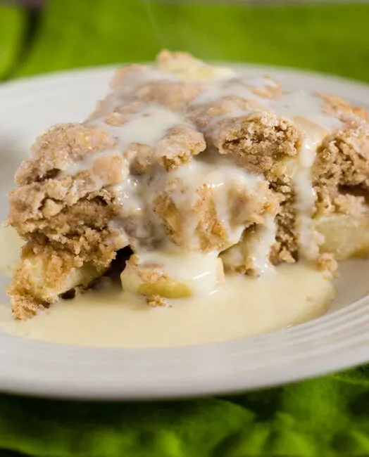 Irish apple cake has a scone-like texture and is studded with chopped apples. Serve with vanilla sauce for a delicious dessert.