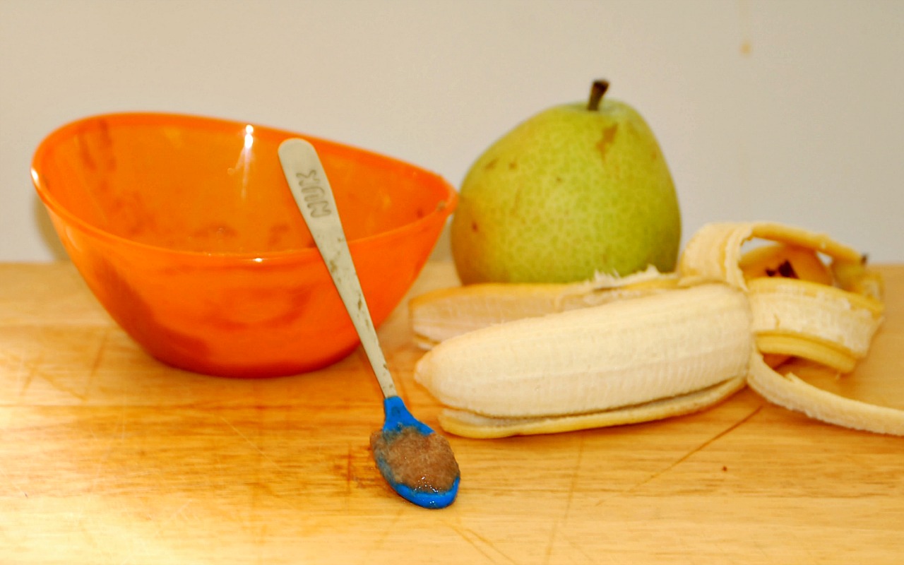 On this particular day, Liam's breakfast was two ounces of pear-banana puree with a tablespoonful of iron-fortified organic oatmeal.