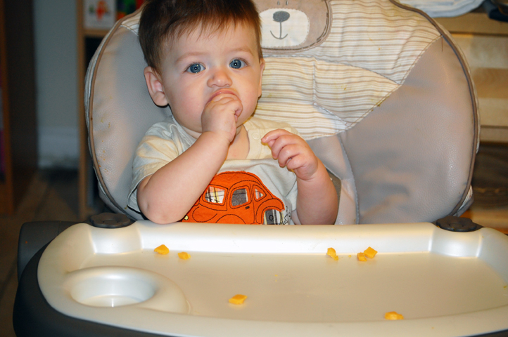 Liam will be 8 months on Saturday (!?!). He will now eat just about everything we put in front of him. He's also much more interested in "helping" us spoon-feed him his purees. His idea of "helping" is to grab the spoon right at the tip, where the food is, smearing it all over his hands and in between his fingers. So, we've started offering him some finger foods, to give him practice feeding himself.