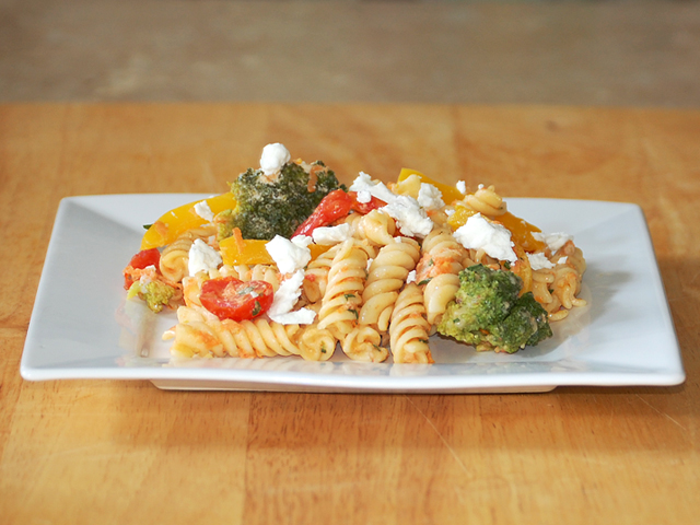 The bright colors and light flavors of this dish are perfect for a hot summer day. Melted Parmesan and goat cheeses create a light, flavorful sauce — do not skip the goat cheese!If it's really unbearable outside, cook it in the morning before it gets too hot, and refrigerate it. Serve it cold for dinner. If you must have some protein, add chicken or shrimp.