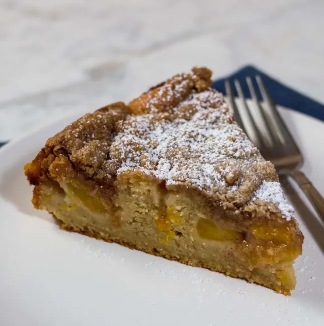 Peach brown butter coffee cake is loaded with peach slices and covered in cinnamon-spiced streusel crumbs. Enjoy it for brunch, dessert, or a snack any time of day!