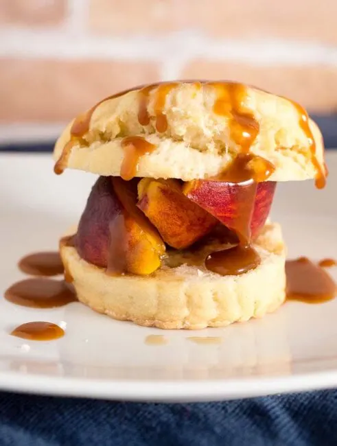 Like the classic strawberry version, peach shortcake combines a sweet biscuit with brandied brown-sugar peaches, and is topped off with a drizzle of salted caramel sauce. #CookoutWeek