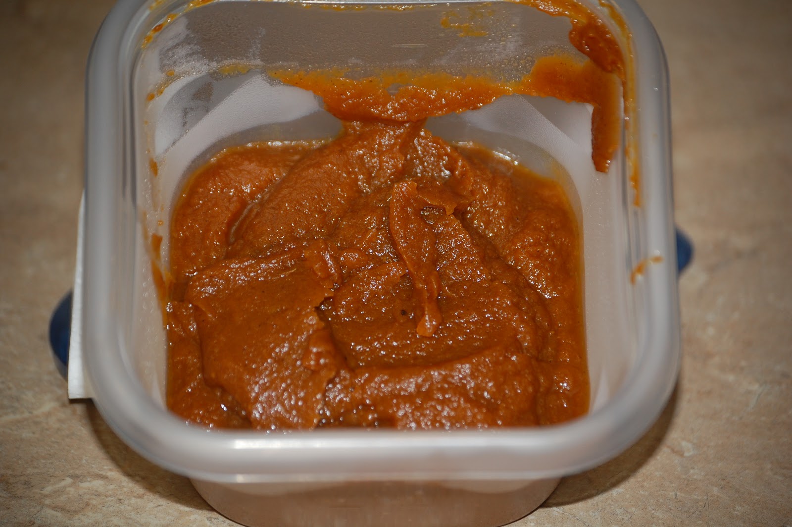 I got this recipe from a fellow member of a pet-related message board on which I post. This is so simple to make and so amazingly tasty. The batch below will yield about four cups of pumpkin butter.