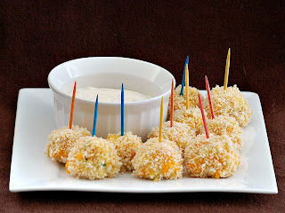 These chicken bites are a bit laborious, especially if you're cooking and shredding your own chicken. But they are delicious and well-worth the effort. Spicy, cheesy chicken is surrounded by a coating of crunchy panko crumbs, and served alongside a cool ranch dipping sauce (substitute bleu cheese if you prefer). Make sure you use either low-fat or full-fat cream cheese and dressing rather than fat-free — the fat helps cut the spiciness.