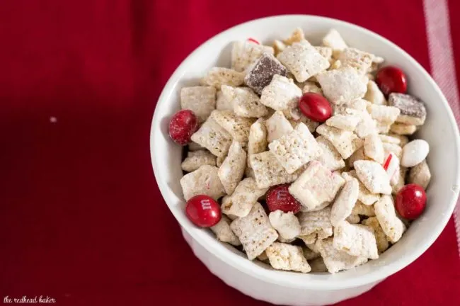 When you leave out Santa's cookies and milk, don't forget the reindeer chow! This snack mixes white chocolate muddy buddies with peppermint treats.