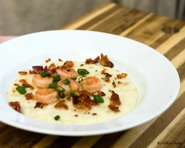 Shrimp and grits are a traditional southern breakfast. Sauteed shrimp are served over grits flavored with sharp Cabot cheddar cheese. #BrunchWeek TheRedheadBaker.com