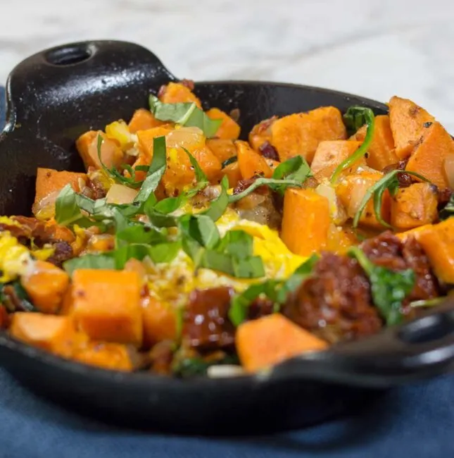 Brunch doesn't have to be a diet-buster! Sweet potato hash with pancetta, sun-dried tomatoes and spinach is a filling yet nutritious breakfast dish.