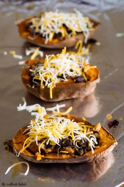 Twice-baked sweet potatoes are stuffed with a mixture of mashed sweet potatoes, black beans, onion, garlic and spices, and topped with melty Borden® Cheese for a healthier vegetarian dinner. #BordenCheeseLove #Ad