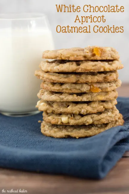 Home » Desserts and Sweets » White Chocolate Apricot Oatmeal Cookies White chocolate apricot oatmeal cookies are crisp at the edges and tender in the middle, and loaded with delicious white chocolate chips and dried apricot pieces. Home » Desserts and Sweets » White Chocolate Apricot Oatmeal Cookies